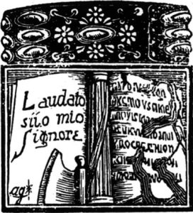 At the birth of the Royal Institute of Pathology of the Book Attilio Giuliani (Rome 1899-Milazzo 1975), master of xylography, created two images, one in which appears the phoenix rising from the fire and bearing the motto of the Institute “Post fata resurgo” , the other in which appear, separated by the fasces, two pages of a book, one of which bears the incipit of the Canticle of the Creatures.