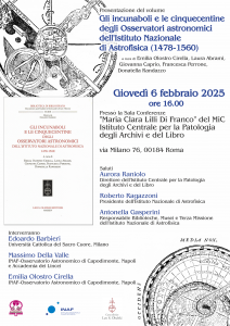On 6 February 2025 at 4 p.m. at the Istituto Centrale per la Patologia degli Archivi e del Libro, there will be a presentation of the book ‘Incunabula and sixteenth-century editions from the astronomical observatories of the Istituto Nazionale di Astrofisica (1478-1560)’ edited by Emilia Olostro Cirella, Laura Abrami, Giovanna Caprio, Francesca Perrone, and Donatella Randazzo. The catalogue is the result of a census of the ancient book heritage preserved in the libraries of the Astronomical and Astrophysical Observatories of the Istituto Nazionale di Astrofisica and describes 227 printed editions of works published between 1478 and 1560.